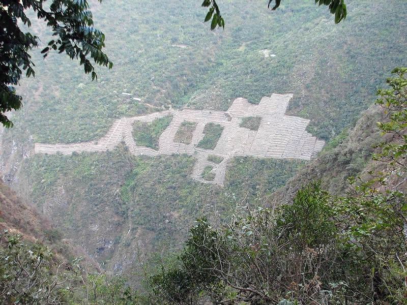 Auf der Westseite des Gipfels befinden sich riesige, abgestufte Terrassen die mit weißen Steineinlagen in Form von Lamas sorgfältig dekoriert sind. Diese sind über einen steilen Dschungelpfad zugänglich, der atemberaubende Ausblicke bietet. Auf der Ostseite, unterhalb des Hauptplatzes, befinden sich die ikonischen Terrassen in Tierform, die die Form eines Meerschweinchens widerspiegeln sollen.