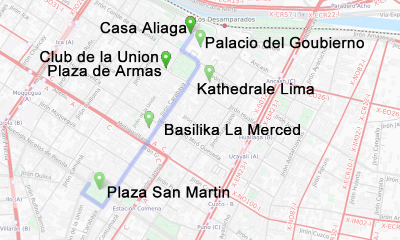 Die Strecke der Tour beträgt 2 km und sie lässt sich in gut 25 Minuten bewältigen (ohne Pausen bei den Attraktionen). Die Route zu den Sehenswürdigkeiten lässt sich hier auf das Handy herunterladen. Viel Spaß beim Erkunden von Limas Altstadt.