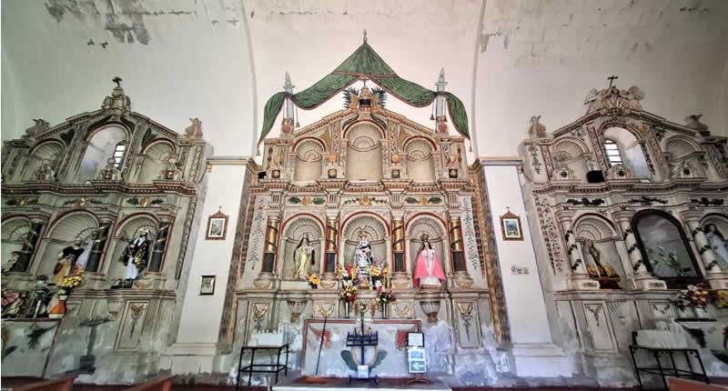 Das Kirchenschiff mit Tonnengewölbe und lateinischem Kreuzgrundriss beherbergt historische Glocken aus den Jahren 1794 und 1861 sowie ein großes steinernes Taufbecken. Im Inneren befinden sich polychrome neoklassizistische Altäre, die eine stilistische Weiterentwicklung gegenüber den früheren barocken Retabeln darstellen und Figuren von Heiligen wie San Pedro de Alcántara, Santa Clara de Asís und der Jungfrau mit dem Kind enthalten.
